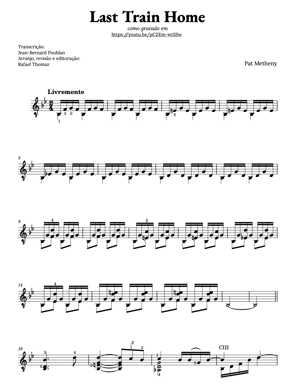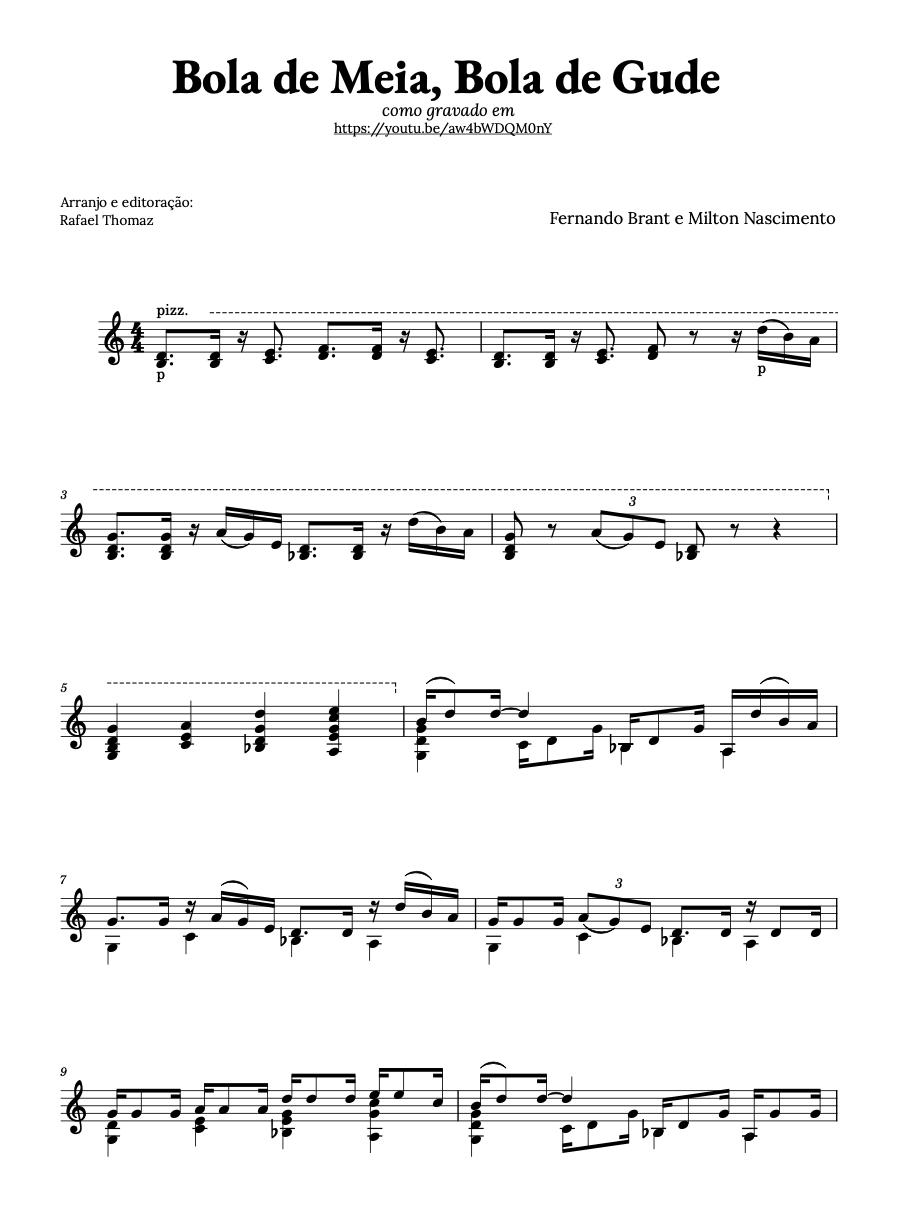 Este e-book reúne 15 obras do repertório popular arranjadas para violão solo. Estes arranjos foram elaborados como parte da pesquisa artística do violonista Rafael Thomaz e sua busca por ampliar o repertório do instrumento, bem como manter o contato com grandes músicas. Todos os arranjos encontram-se gravados no canal do youtube e os links estão listados em cada partitura.